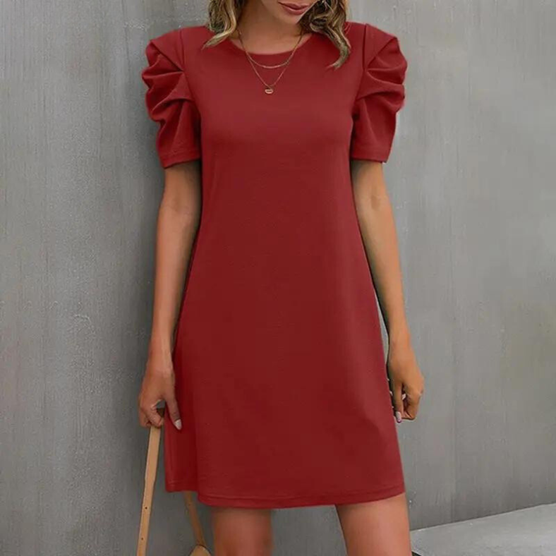 Pofmouwen voor een speelse touch: De pofmouwen voegen een vleugje speelsheid toe aan het klassieke silhouet van de jurk, waardoor je er trendy en eigentijds uitziet.